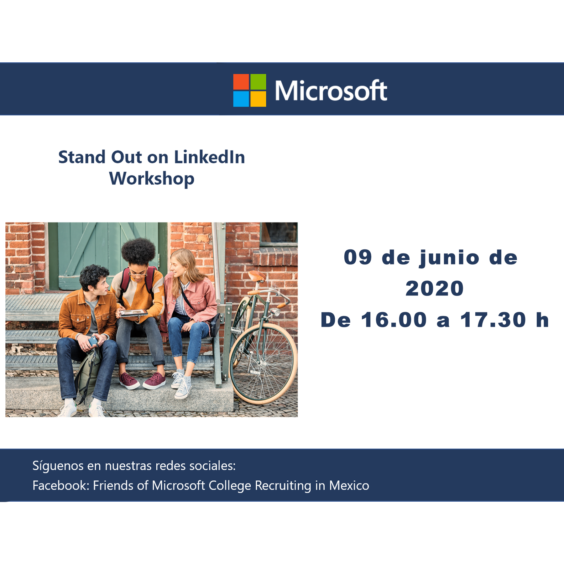 Microsoft en conjunto con la Bolsa de Trabajo invita al webinar Stand Out on LinkedIn Workshop, dirigido a alumnos de cualquier semestre y exalumnos de todas las licenciaturas e ingenierías.